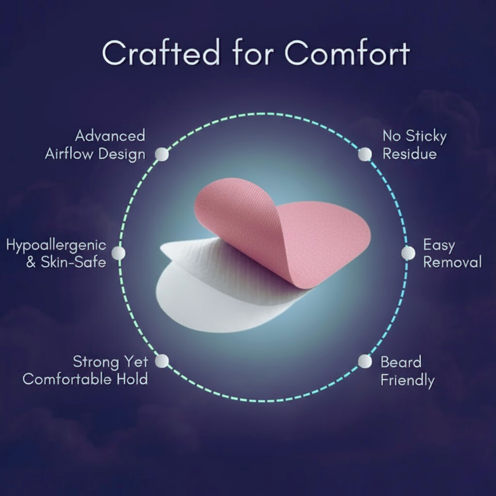Breathe Aid is a soft, hypoallergenic mouth tape designed to gently encourage nasal breathing throughout the night. By comfortably keeping your mouth closed, it helps reduce snoring, improve oxygen intake, and prevent dry mouth — all while supporting deeper, more restful sleep.